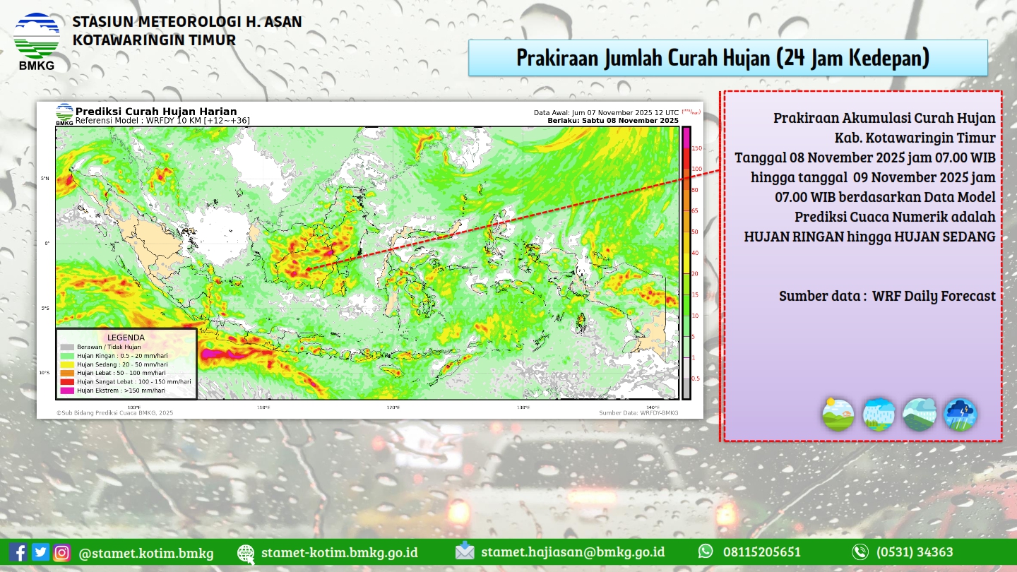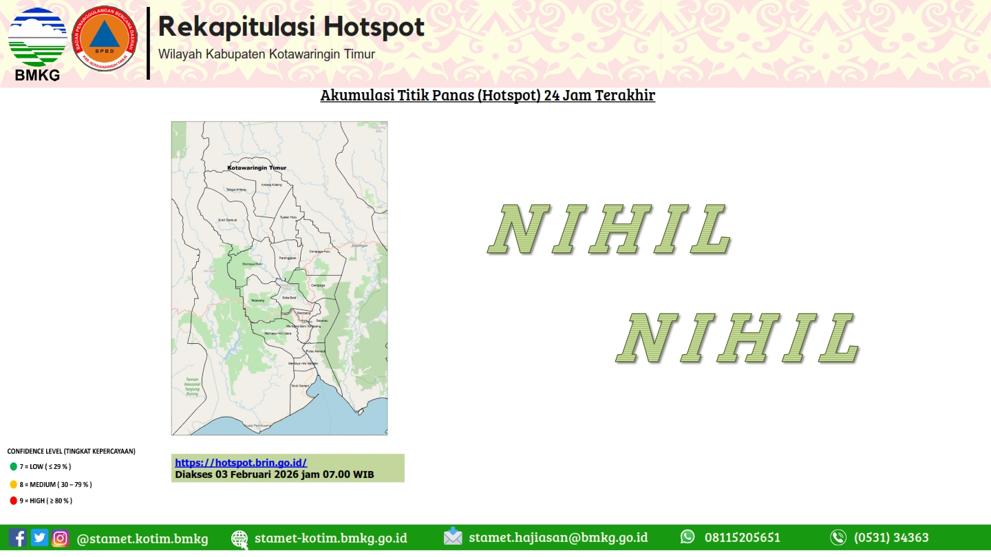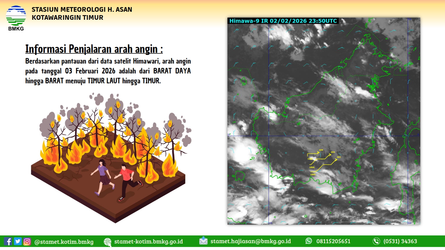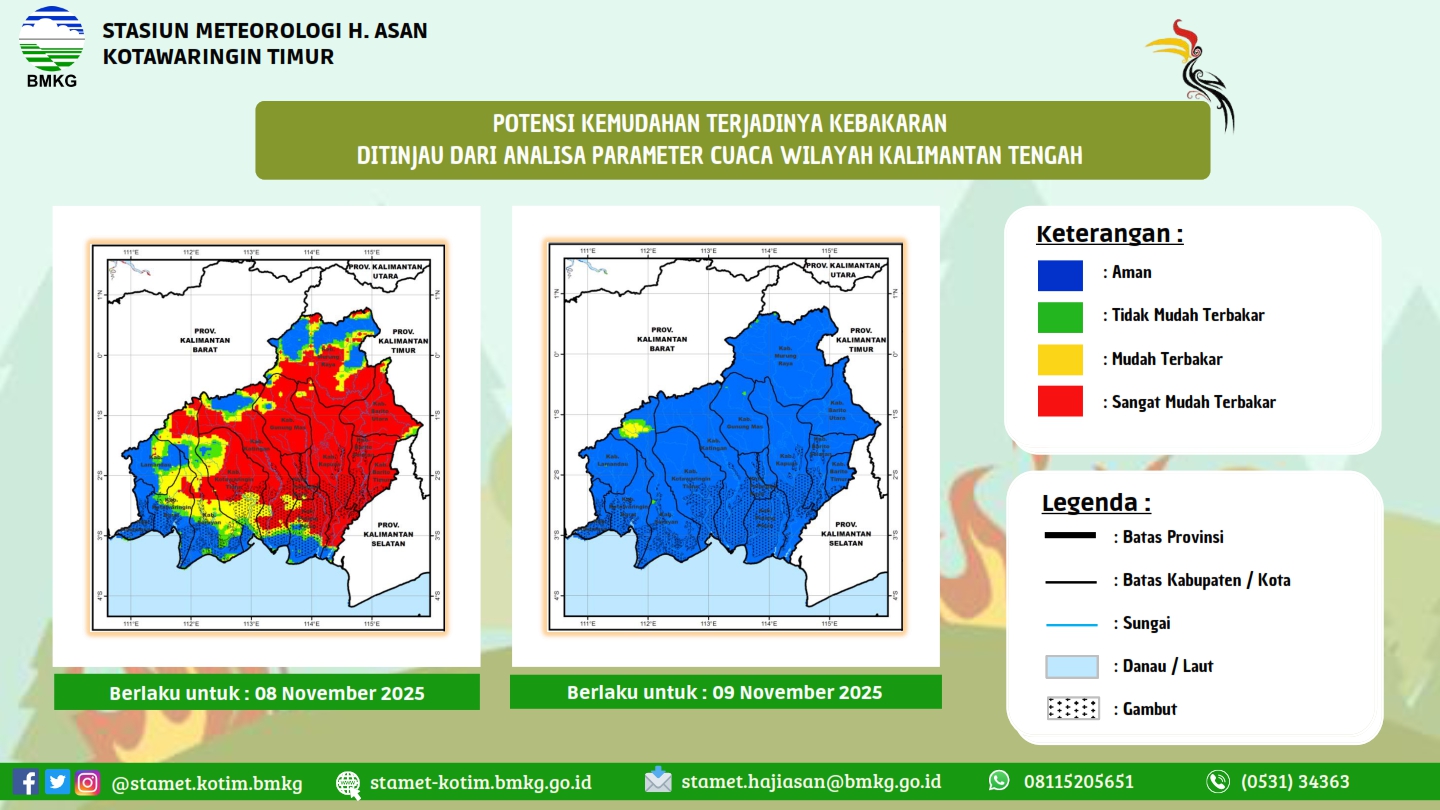 tgl 2 Agustus 2023 pkl 14:50 WIB masih berpotensi terjadi Hujan Sedang-Lebat yang dapat disertai Kilat/Petir dan Angin Kencang pada pkl. 15:00 WIB di Kabupaten Kotawaringin Timur: Mentawa Baru Ketapang, Telawang, Kabupaten Sukamara: Jelai, Pantai Lunci, Kabupaten Lamandau: Lamandau, dan sekitarnya. Dan dapat meluas ke wilayah Kabupaten Kotawaringin Barat: Kumai, Arut Selatan, Kotawaringin Lama, Arut Utara, Pangkalan Lada, Pangkalan Banteng, Kabupaten Kotawaringin Timur: Kota Besi, Cempaga, Mentaya Hulu, Parenggean, Baamang, Mentaya Hilir Utara, Mentaya Hilir Selatan, Pulau Hanaut, Teluk Sampit, Seranau, Bukit Santuai, Telaga Antang, Kabupaten Kapuas: Kapuas Timur, Basarang, Mantangai, Timpah, Bataguh, Kabupaten Barito Selatan: Karau Kuala, Dusun Selatan, Kabupaten Barito Utara: Gunung Purei, Teweh Timur, Kabupaten Katingan: Kamipang, Mendawai, Katingan Kuala, Kabupaten Seruyan: Seruyan Hilir, Seruyan Tengah, Danau Sembuluh, Hanau, Seruyan Hilir Timur, Seruyan Raya, Danau Seluluk, Batu Ampar, Kabupaten Sukamara: Sukamara, Balai Riam, Permata Kecubung, Kabupaten Lamandau: Delang, Bulik, Bulik Timur, Menthobi Raya, Sematu Jaya, Belantikan Raya, Batang Kawa, Kabupaten Pulang Pisau: Pandih Batu, Maliku, Sebangau Kuala, Kabupaten Barito Timur: Dusun Timur, Banua Lima, Patangkep Tutui, Awang, Paju Epat, Paku, Karusen Janang, dan sekitarnya. Kondisi ini diperkirakan masih akan berlangsung hingga pkl 17:00 WIB