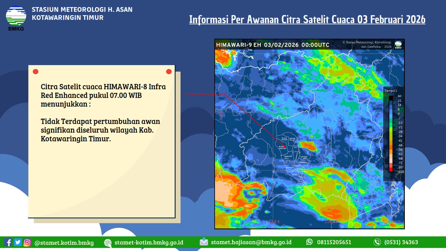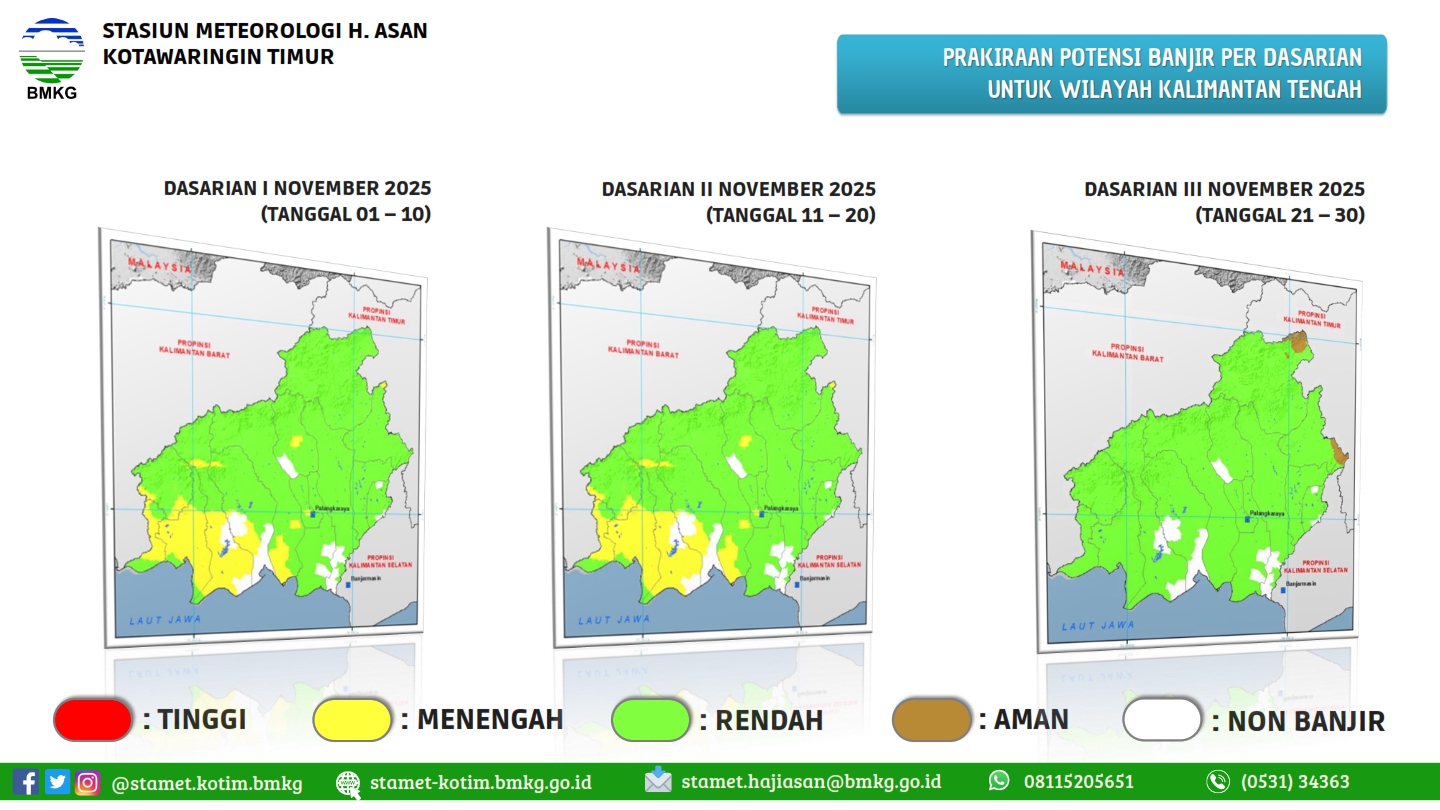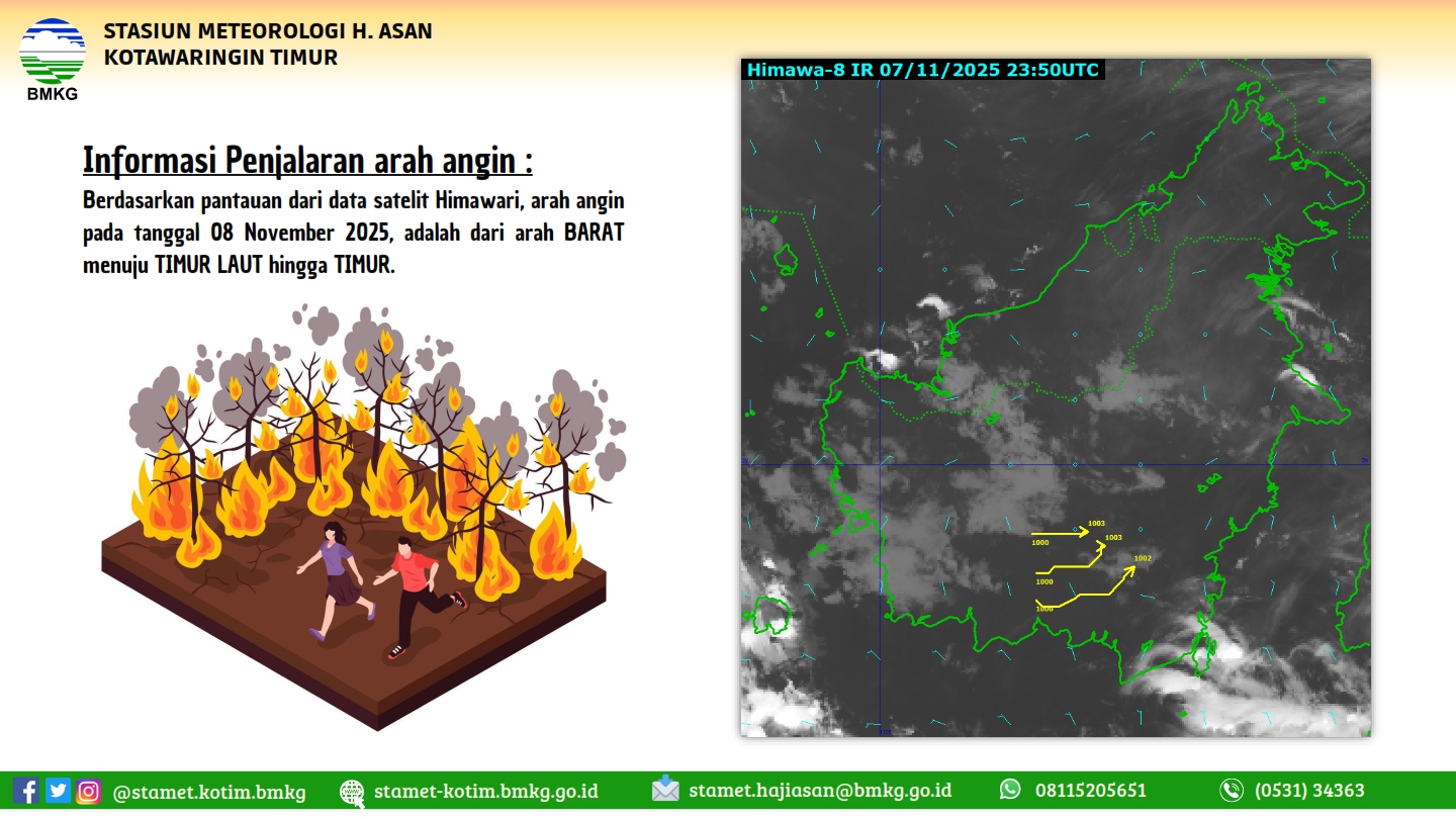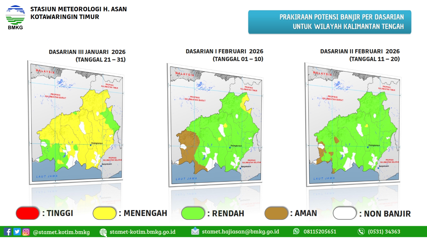 tgl 2 Agustus 2023 pkl 14:50 WIB masih berpotensi terjadi Hujan Sedang-Lebat yang dapat disertai Kilat/Petir dan Angin Kencang pada pkl. 15:00 WIB di Kabupaten Kotawaringin Timur: Mentawa Baru Ketapang, Telawang, Kabupaten Sukamara: Jelai, Pantai Lunci, Kabupaten Lamandau: Lamandau, dan sekitarnya. Dan dapat meluas ke wilayah Kabupaten Kotawaringin Barat: Kumai, Arut Selatan, Kotawaringin Lama, Arut Utara, Pangkalan Lada, Pangkalan Banteng, Kabupaten Kotawaringin Timur: Kota Besi, Cempaga, Mentaya Hulu, Parenggean, Baamang, Mentaya Hilir Utara, Mentaya Hilir Selatan, Pulau Hanaut, Teluk Sampit, Seranau, Bukit Santuai, Telaga Antang, Kabupaten Kapuas: Kapuas Timur, Basarang, Mantangai, Timpah, Bataguh, Kabupaten Barito Selatan: Karau Kuala, Dusun Selatan, Kabupaten Barito Utara: Gunung Purei, Teweh Timur, Kabupaten Katingan: Kamipang, Mendawai, Katingan Kuala, Kabupaten Seruyan: Seruyan Hilir, Seruyan Tengah, Danau Sembuluh, Hanau, Seruyan Hilir Timur, Seruyan Raya, Danau Seluluk, Batu Ampar, Kabupaten Sukamara: Sukamara, Balai Riam, Permata Kecubung, Kabupaten Lamandau: Delang, Bulik, Bulik Timur, Menthobi Raya, Sematu Jaya, Belantikan Raya, Batang Kawa, Kabupaten Pulang Pisau: Pandih Batu, Maliku, Sebangau Kuala, Kabupaten Barito Timur: Dusun Timur, Banua Lima, Patangkep Tutui, Awang, Paju Epat, Paku, Karusen Janang, dan sekitarnya. Kondisi ini diperkirakan masih akan berlangsung hingga pkl 17:00 WIB