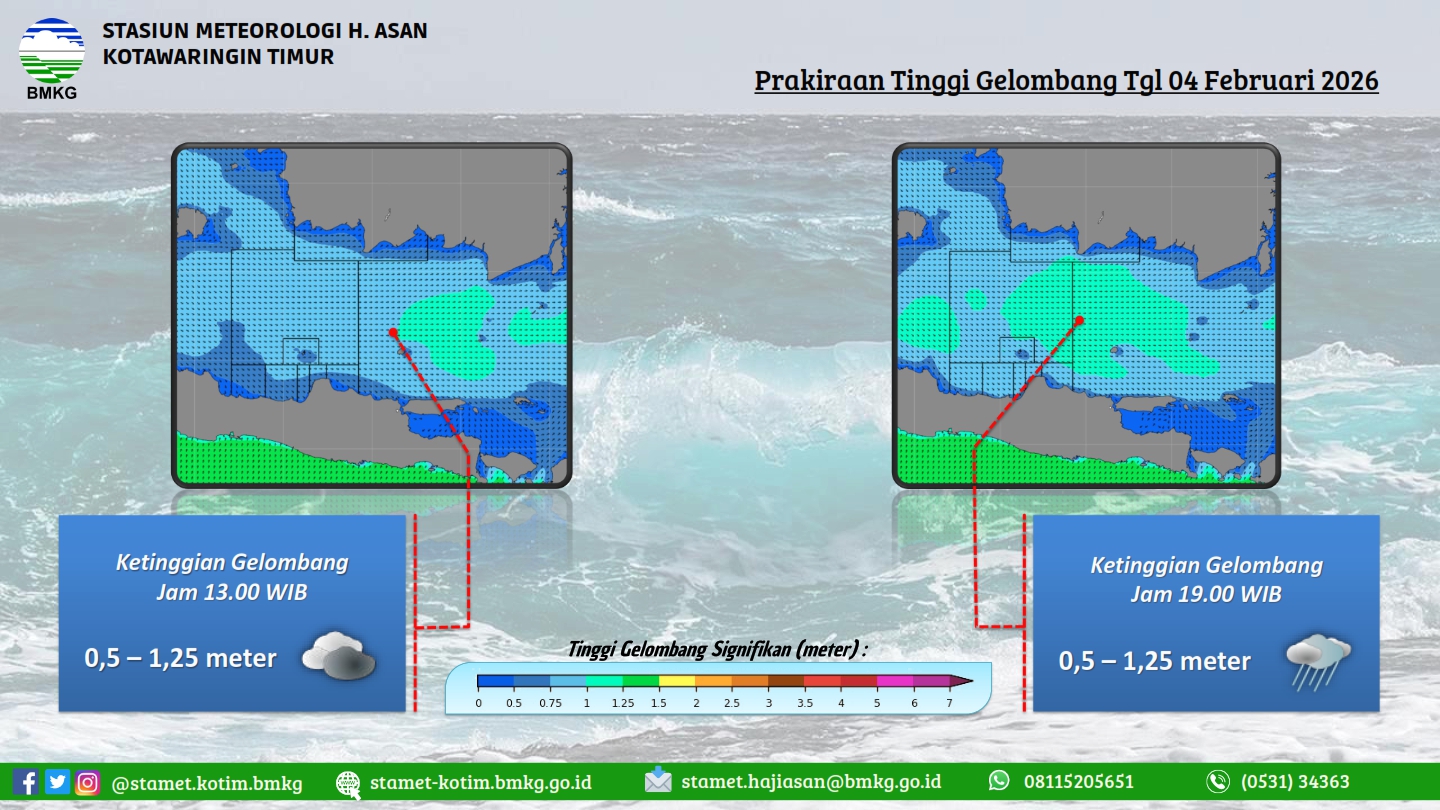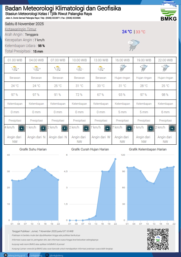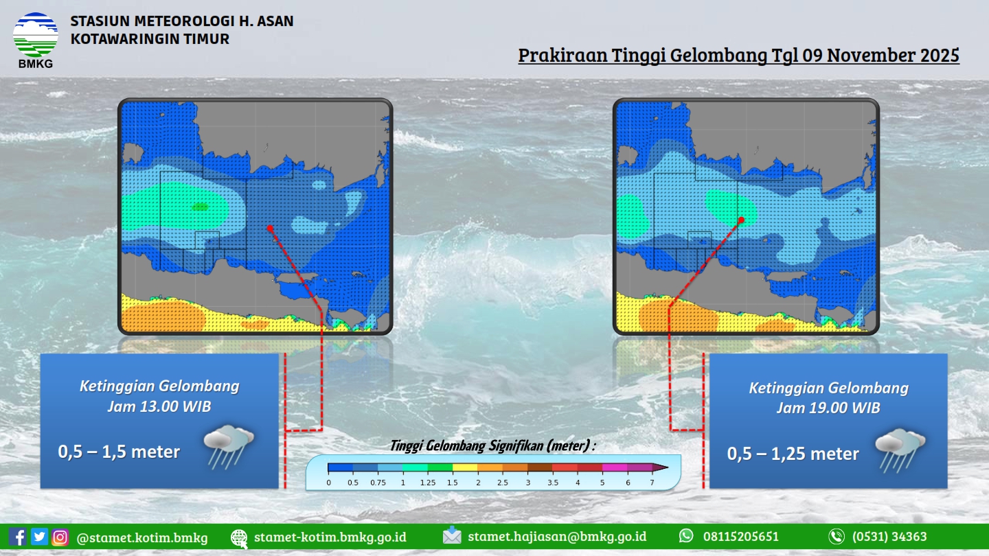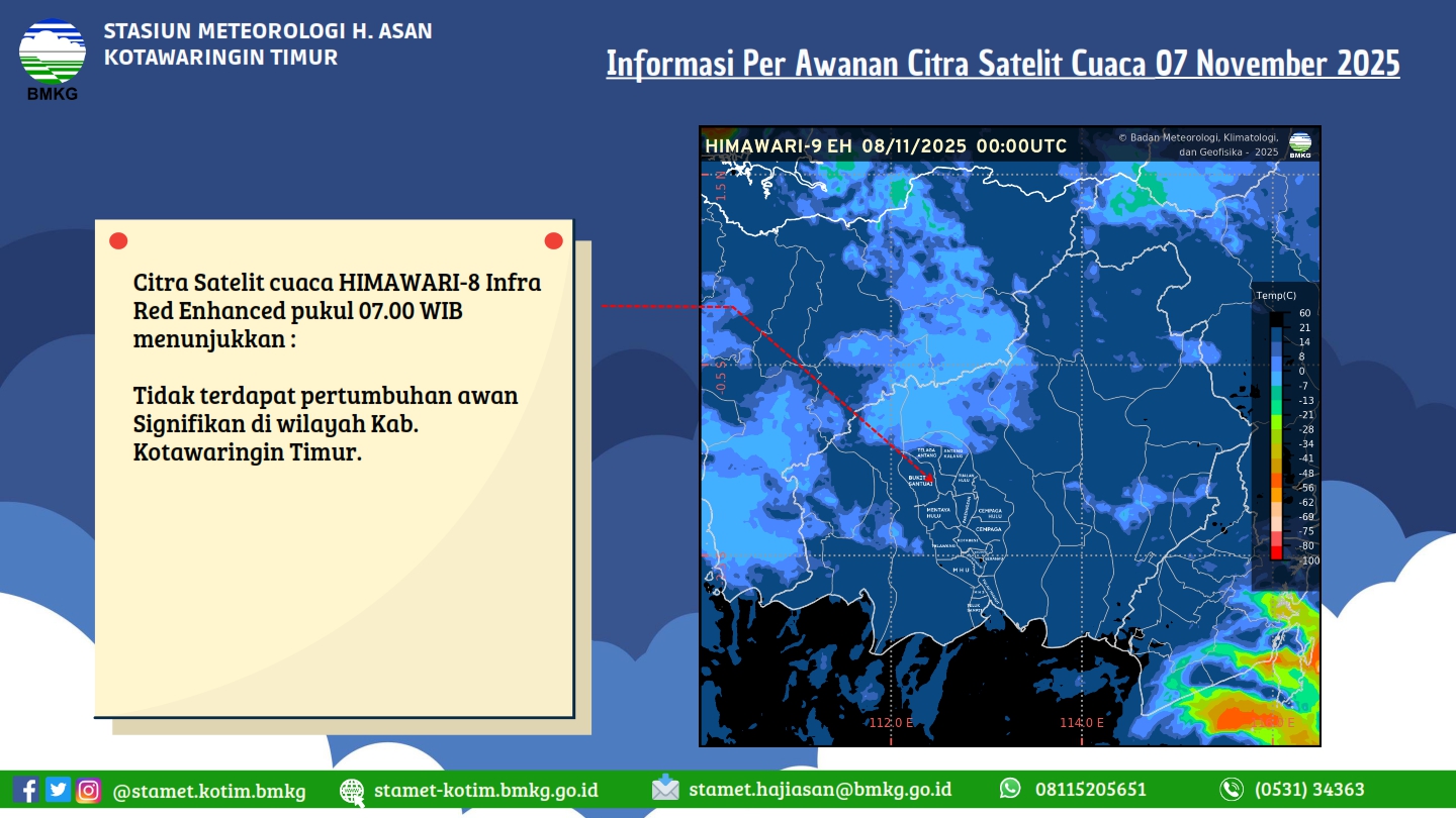 tgl 2 Agustus 2023 pkl 14:50 WIB masih berpotensi terjadi Hujan Sedang-Lebat yang dapat disertai Kilat/Petir dan Angin Kencang pada pkl. 15:00 WIB di Kabupaten Kotawaringin Timur: Mentawa Baru Ketapang, Telawang, Kabupaten Sukamara: Jelai, Pantai Lunci, Kabupaten Lamandau: Lamandau, dan sekitarnya. Dan dapat meluas ke wilayah Kabupaten Kotawaringin Barat: Kumai, Arut Selatan, Kotawaringin Lama, Arut Utara, Pangkalan Lada, Pangkalan Banteng, Kabupaten Kotawaringin Timur: Kota Besi, Cempaga, Mentaya Hulu, Parenggean, Baamang, Mentaya Hilir Utara, Mentaya Hilir Selatan, Pulau Hanaut, Teluk Sampit, Seranau, Bukit Santuai, Telaga Antang, Kabupaten Kapuas: Kapuas Timur, Basarang, Mantangai, Timpah, Bataguh, Kabupaten Barito Selatan: Karau Kuala, Dusun Selatan, Kabupaten Barito Utara: Gunung Purei, Teweh Timur, Kabupaten Katingan: Kamipang, Mendawai, Katingan Kuala, Kabupaten Seruyan: Seruyan Hilir, Seruyan Tengah, Danau Sembuluh, Hanau, Seruyan Hilir Timur, Seruyan Raya, Danau Seluluk, Batu Ampar, Kabupaten Sukamara: Sukamara, Balai Riam, Permata Kecubung, Kabupaten Lamandau: Delang, Bulik, Bulik Timur, Menthobi Raya, Sematu Jaya, Belantikan Raya, Batang Kawa, Kabupaten Pulang Pisau: Pandih Batu, Maliku, Sebangau Kuala, Kabupaten Barito Timur: Dusun Timur, Banua Lima, Patangkep Tutui, Awang, Paju Epat, Paku, Karusen Janang, dan sekitarnya. Kondisi ini diperkirakan masih akan berlangsung hingga pkl 17:00 WIB